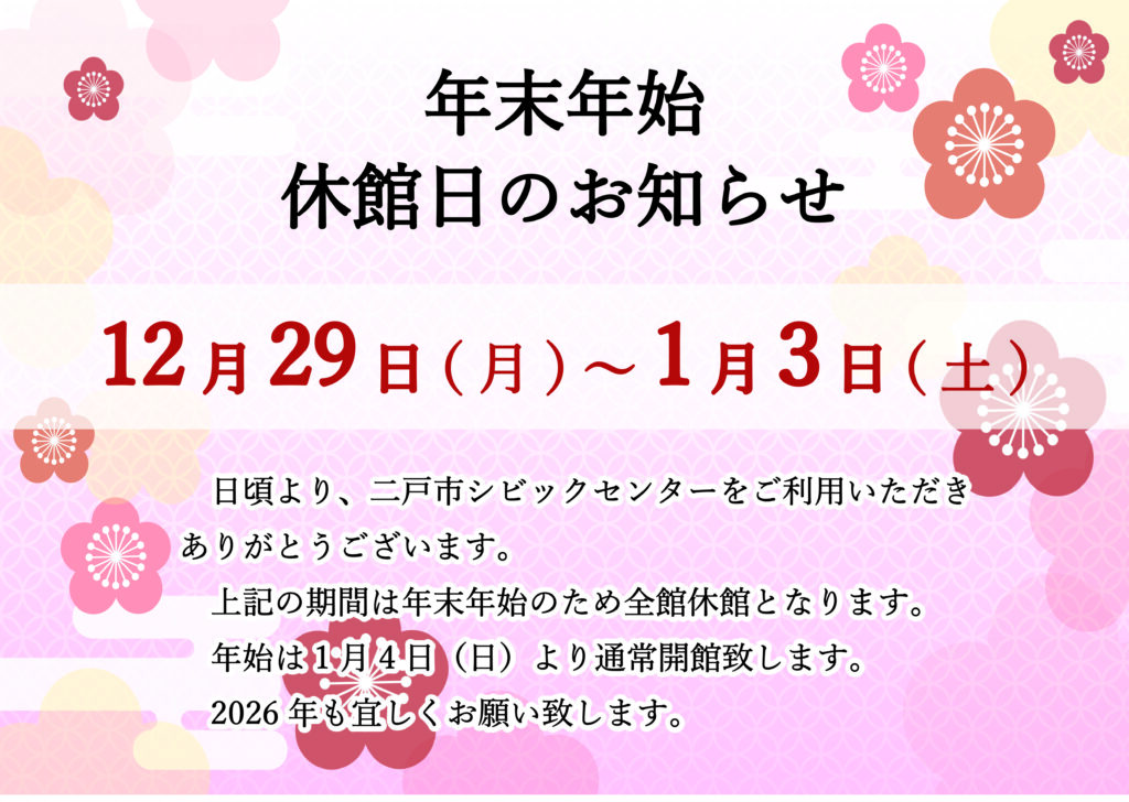 2025年12月23日 / 最終更新日時 : 2025年12月23日 ninohe-civic シビックセンター 年末年始休館日のお知らせ日頃より、二戸市シビックセンターをご利用いただき、有難うございます。12月29(月)~1月3日(土)の期間は年末年始のため全館休館となります。年始は1月4日(日)から通常開館いたします。2026年も宜しくお願いいたします。