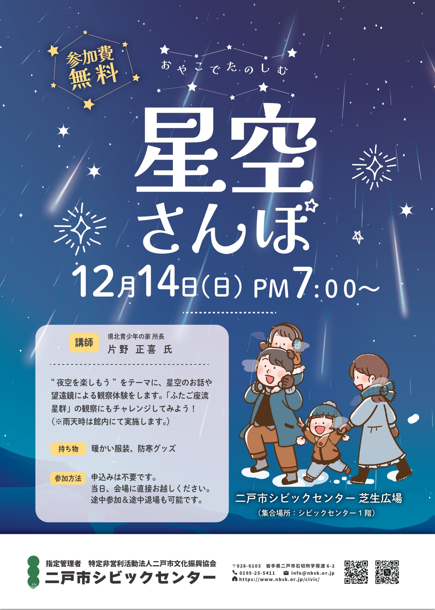 ”夜空を楽しもう”をテーマに、星空のお話や望遠鏡による観察体験をします。「ふたご座流星群」の観察にもチャレンジしてみよう!