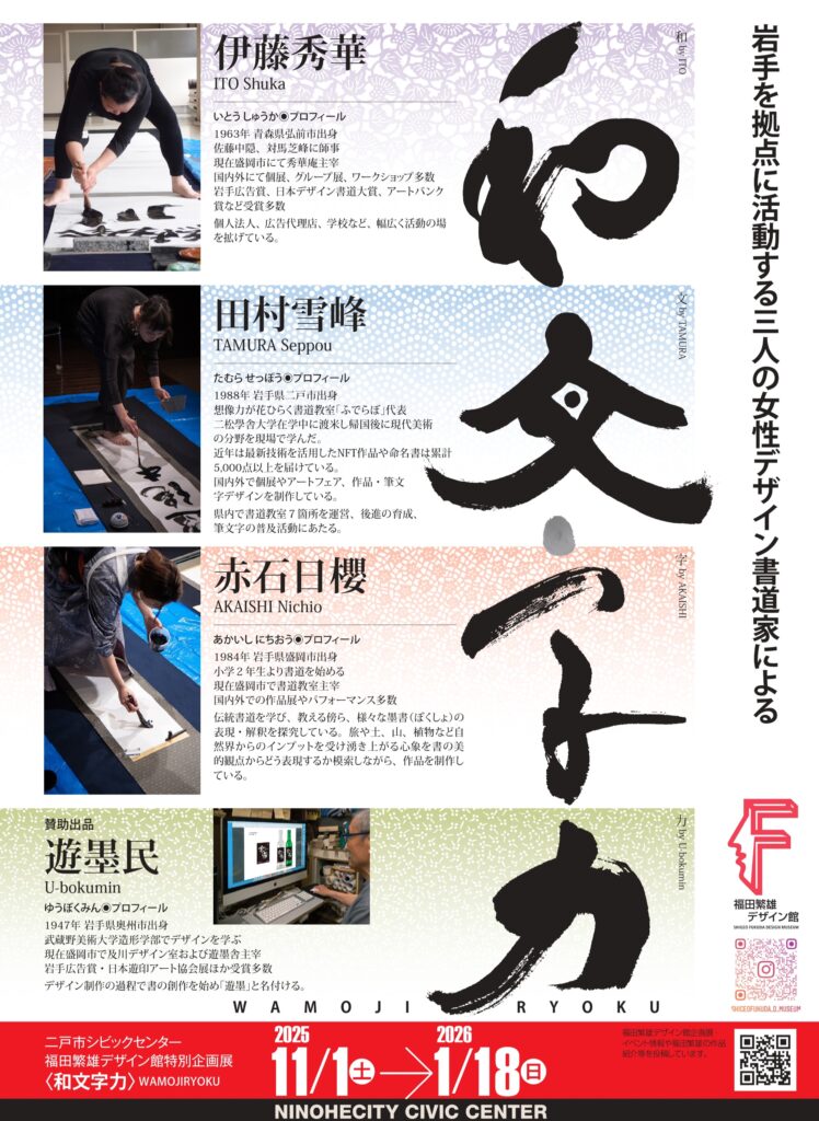 本企画展では、岩手において書家として確固たる道を歩みながら、デザイン書道にも積極的に取り組んでいる作家たちの作品を紹介します。