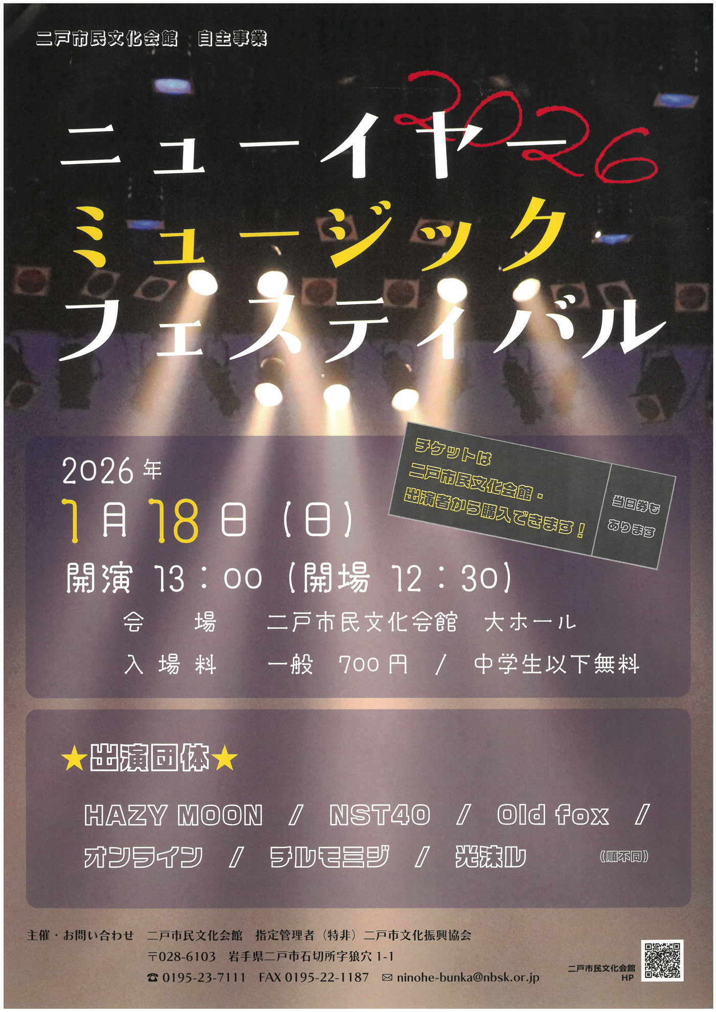 イベント主催・共催事業自主事業 【1/18(日)】ニューイヤーミュージックフェスティバル2026 2025年12月3日 2nohekaikan@195 開催日2026年1月18日(日)場所二戸市民文化会館 大ホール時間13時開演予定入場料金・一般700円・中学生以下無料プレイガイド二戸市民文化会館、出演者から購入できます。※当日券もあります主催二戸市民文化会館お問い合わせ二戸市民文化会館〒028-6103岩手県二戸市石切所字狼穴1-1TEL:0195-23-7111FAX:0195-22-1187メール ninohe-bunka(アットマーク)nbsk.or.jp