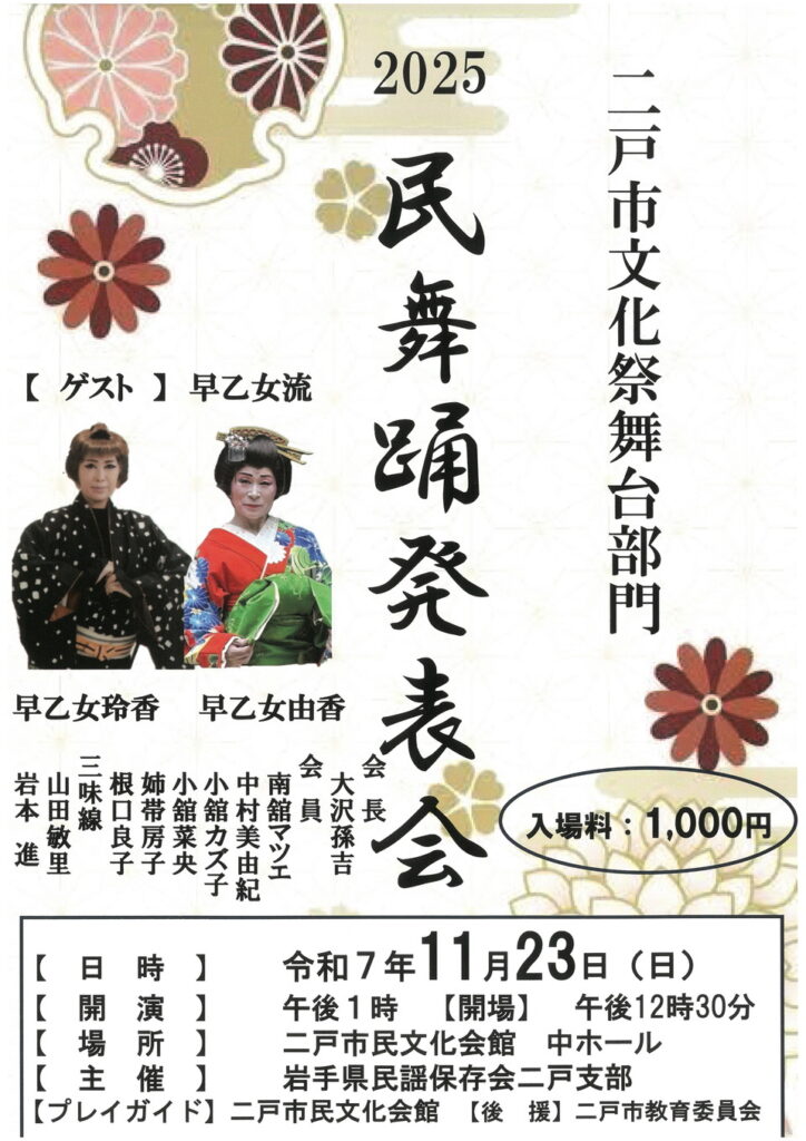 過去のイベント 【11/23(日)】2025民舞踊発表会 2025年9月25日 2nohekaikan@195 開催日時2025年11月23日(日)13時開演(開場12時30分)場所二戸市民文化会館 中ホールプレイガイド二戸市民文化会館入場料金1000円主催岩手県民謡保存会二戸支部