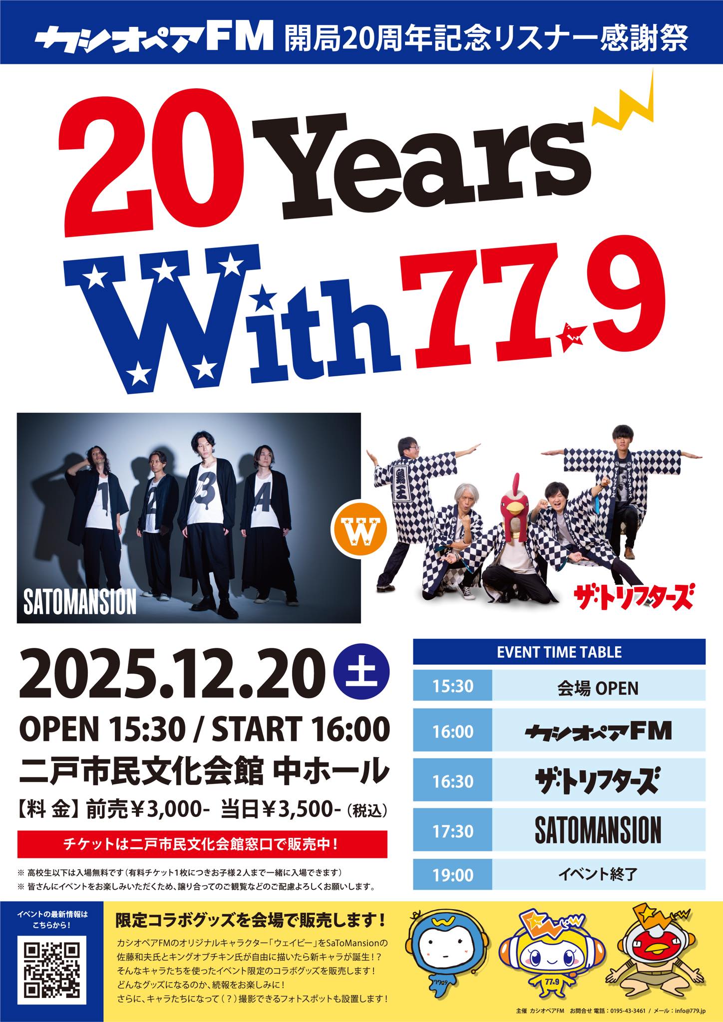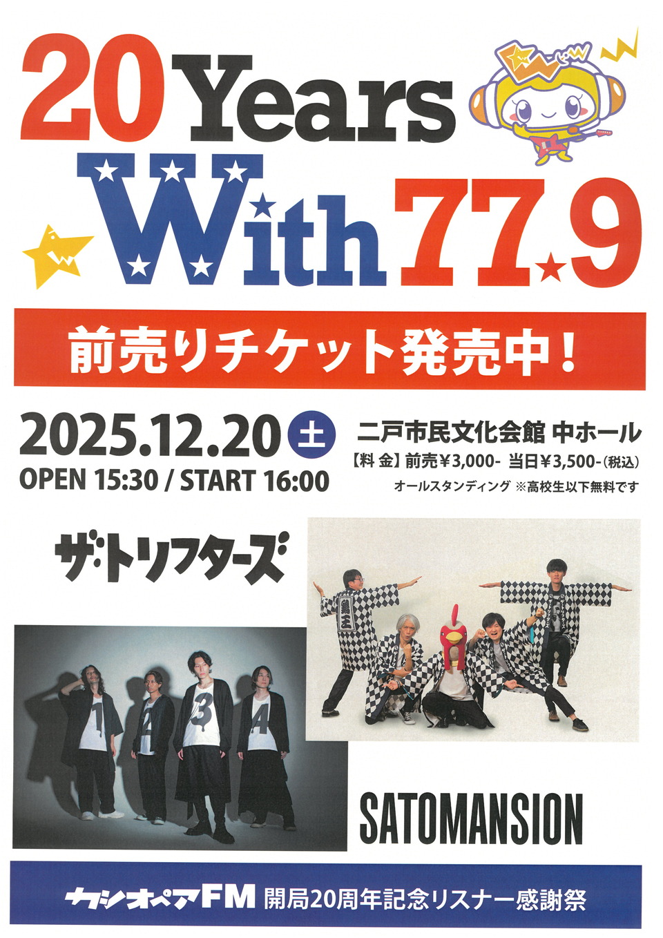 イベント 【12/20(土)】カシオペアFM開局20周年リスナー感謝祭 2025年9月20日 2nohekaikan@195 開催日時2025年12月20日(土) 16時開演(15時30分開場)場所二戸市民文化会館 中ホール入場料金前売り3000円当日3500円オールスタンディング※高校生以下無料主催主催:カシオペアFM