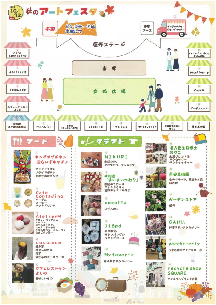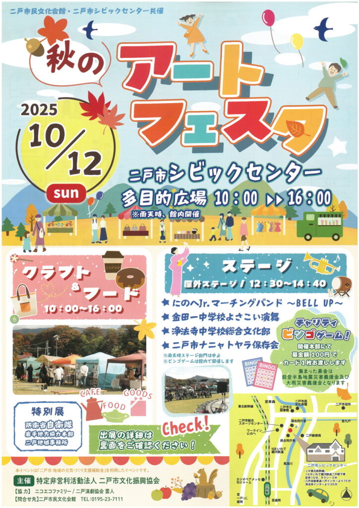 イベント 【10/12(日)】秋のアートフェスタ 2025年9月29日 2nohekaikan@195 開催日時2025年10月12日(日) 10時~16時場所二戸市シビックセンター 多目的広場※雨天時館内開催主催主催:特定非営利活動法人 二戸市文化振興協会