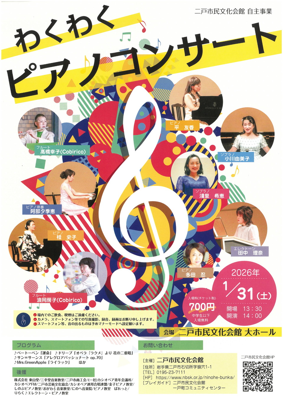 イベント 主催・共催事業 自主事業 【1/31(土)】わくわくピアノコンサート 2025年12月2日 2nohekaikan@195 開催日2026年1月31日(土)場所二戸市民文化会館 大ホール時間14時開演(13:30開場)入場料金・一般700円・中学生以下無料プレイガイド二戸市民文化会館主催二戸市民文化会館お問い合わせ二戸市民文化会館〒028-6103岩手県二戸市石切所字狼穴1-1TEL:0195-23-7111FAX:0195-22-1187メール ninohe-bunka(アットマーク)nbsk.or.jp