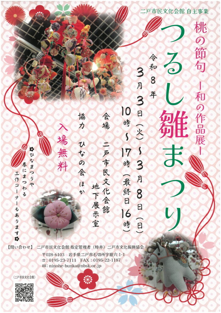 イベント 主催・共催事業 自主事業 【3/3(火)~3/8(日)】つるし雛まつり 2026年2月2日 2nohekaikan@195 開催日2025年3月3日(火)~3月8日(日)場所二戸市民文化会館 地下展示室開演時刻10時~17時(最終日は16時まで)入場料金入場無料主催二戸市民文化会館お問い合わせ 二戸市民文化会館 指定管理者(特非)二戸市文化振興協会0195-23-7111