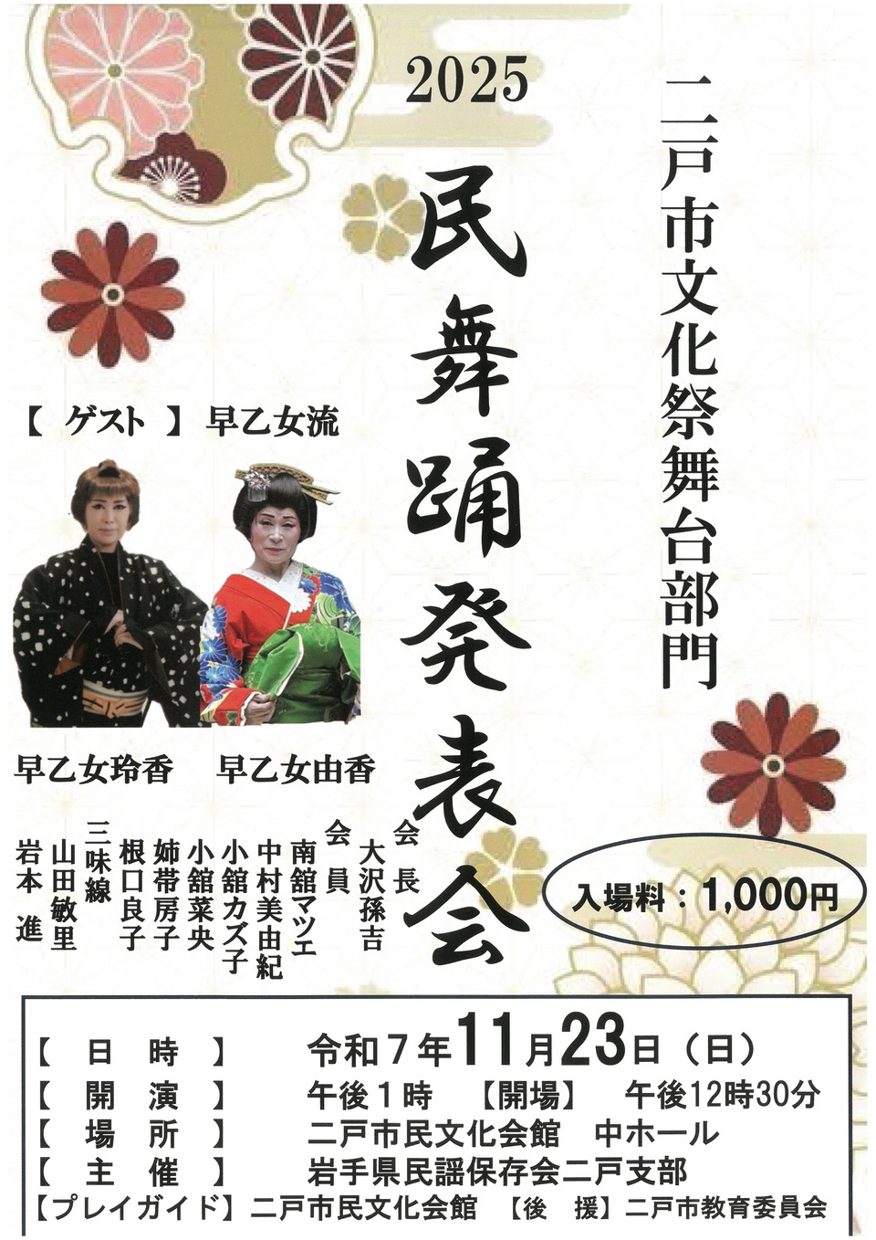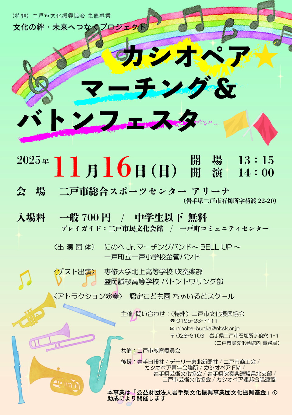 現在窓口でお買い求めいただけるチケット 二戸市民文化会館 開催イベント 【11/23(日)】2025民舞踊発表会 | 二戸市民文化会館 【12/20(土)】カシオペアFM開局20周年リスナー感謝祭 | 二戸市民文化会館 他会場 開催イベント 【12/7(日)】いわてブリティッシュブラスバンド第15回定期演奏会 会場:盛岡市 都南文化会館(キャラホール)日時:12月7日(日) 14:00開演 (開場13:30)入場料:前売り一般700円 高校生以下500円 (当日券/200円増) (小学生以下 入場無料)主催:いわてブリティッシュブラスバンドTEL:090-3649-1029 【12/7(日)】未来に紡ぐ民謡の祭典会場:SG GROUPホールはちのへ(八戸市公会堂)日時:12月7日(日) 14:00開演 (開場13:00)入場料:全席自由3000円主催:デーリー東北新聞社 ホームへ戻る