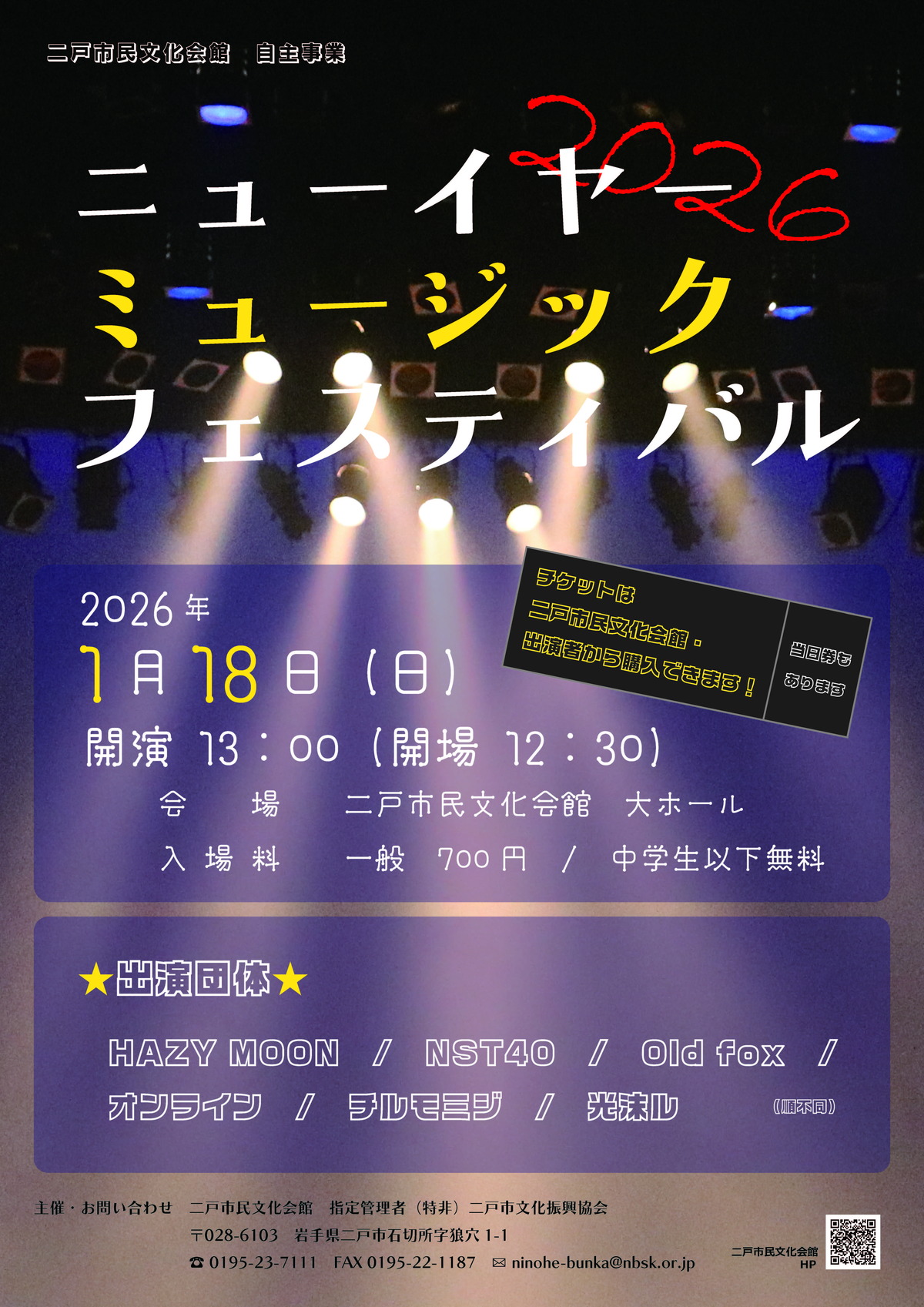 現在窓口でお買い求めいただけるチケット 二戸市民文化会館 開催イベント 【12/20(土)】カシオペアFM開局20周年リスナー感謝祭 | 二戸市民文化会館 【1/18(日)】ニューイヤーミュージックフェスティバル2026 | 二戸市民文化会館 【2/7(土)】くまさん音楽隊 第三回音楽会 | 二戸市民文化会館 他会場 開催イベント 【12/7(日)】いわてブリティッシュブラスバンド第15回定期演奏会 会場:盛岡市 都南文化会館(キャラホール)日時:12月7日(日) 14:00開演 (開場13:30)入場料:前売り一般700円 高校生以下500円 (当日券/200円増) (小学生以下 入場無料)主催:いわてブリティッシュブラスバンドTEL:090-3649-1029 ホームへ戻る