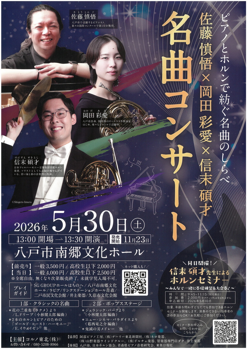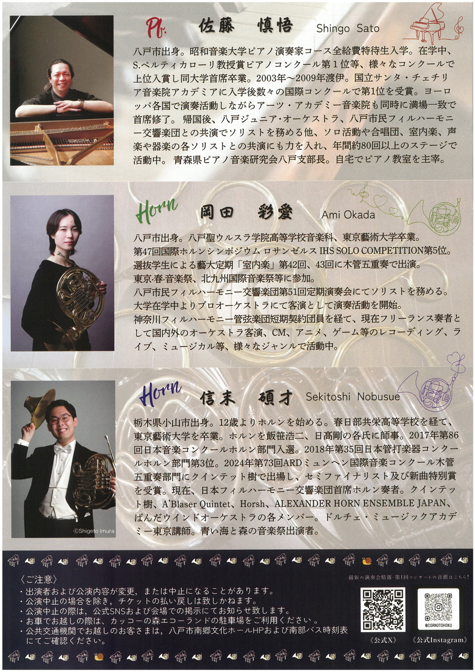 現在窓口でお買い求めいただけるチケット 二戸市民文化会館 開催イベント 【1/25(日)】二戸演劇協会雲人アイキッズ第44回定期公演 | 二戸市民文化会館 【1/31(土)】わくわくピアノコンサート | 二戸市民文化会館 【2/7(土)】くまさん音楽隊 第三回音楽会 | 二戸市民文化会館 【2/22(日)】「揺羅揺羅-Flapper’s Bad-」第3回劇団地底人プロデュース演劇舞台公演 | 二戸市民文化会館 他会場 開催イベント 【ピアノとホルンで紡ぐ名曲の調べ 名曲コンサート】会場:八戸市南郷文化ホール日時:5月30日(土) 13:00開演 (開場13:30)入場料:【前売り】一般3500円、高校生以下2000円【当日】一般4000円、高校生以下2500円※全席自由、無くなり次第販売終了、(未就学児入場不可主催:コルノ東北(株) ホームへ戻る